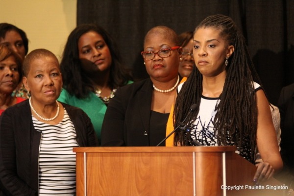 Members of the Black Women’s Roundtable look on as Teresa C. Younger of Ms. Foundation for Women (at podium) expresses her support of the campaign urging NFL commissioner Roger Goodell to get it right by adding Black women to his advisory team. during a press conference held during the CBCF Annual Legislative Conference in DC. PHOTO CREDIT: Paulette Singleton.
