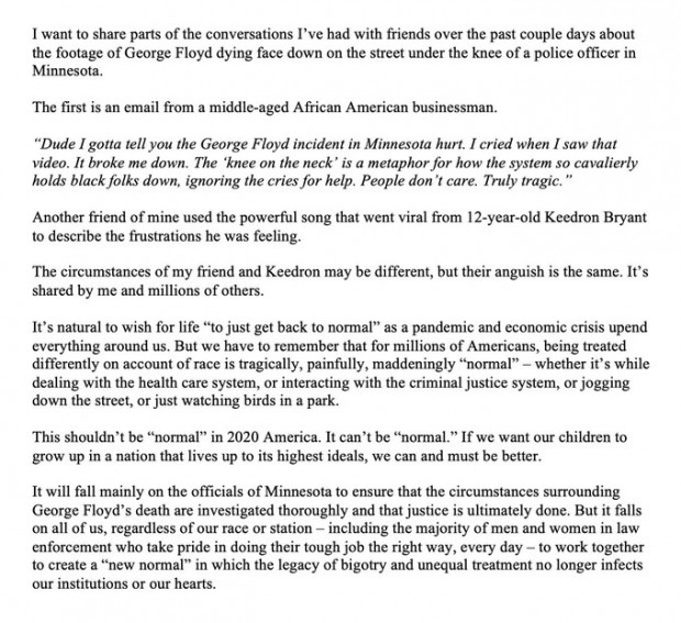 In a statement about four police killing another unarmed man, George Floyd, former President Barack Obama said “This shouldn’t be ‘normal’ in 2020 America. It can’t be ‘normal.’ If we want our children to grow up in a nation that lives up to its highest ideals, we can and must be better.”